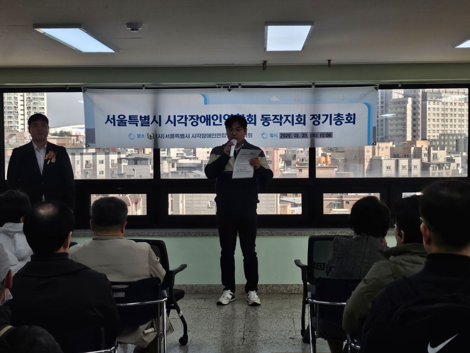 2026년 동작지회 정기총회가 2월 21일 오전 11시에 동작구 시각장애인 쉼터에서 개최되었습니다. 이번 총회에는 지회원 중 37명이 참석하고 12명이 위임하였고, 박일하 구청장님을 비롯한 여러 내빈들께서 참석해주셨습니다.